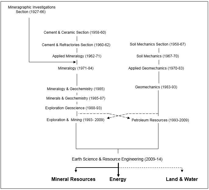 The Cement and Ceramic Section (1958-60) of the Division of Industrial Chemistry became the Cement and Refractories Section in 1960 and then the Division of Applied Mineralogy in 1962. In 1966 the Division of Applied Mineralogy incorporated the Mineragraphic Investigations Section which had been formed in CSIR in 1927 and had operated from then on as an independent section. In 1971 the Division of Applied Mineralogy was renamed the Division of Mineralogy. In the late 1970s part of the Division of Mineralogy broke away, joining the Division of Process Technology to form the Fuel Geosciences Unit. In September 1984, the Division of Mineralogy changed its name to the Division of Mineralogy and Geochemistry. The Division of Mineralogy and Geochemistry had a short lifetime, being renamed the Division of Minerals and Geochemistry, in July 1985. Two years later, the Division changed its name again, becoming the Division of Exploration Geoscience.