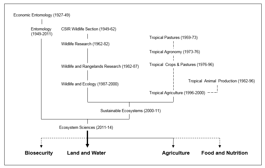 The CSIR Wildlife Survey Section was established in 1949. It became the Division of Wildlife Research in 1962, was renamed the Division of Wildlife and Rangelands Research in 1982 and then renamed again in 1987 to become the Division of Wildlife and Ecology.