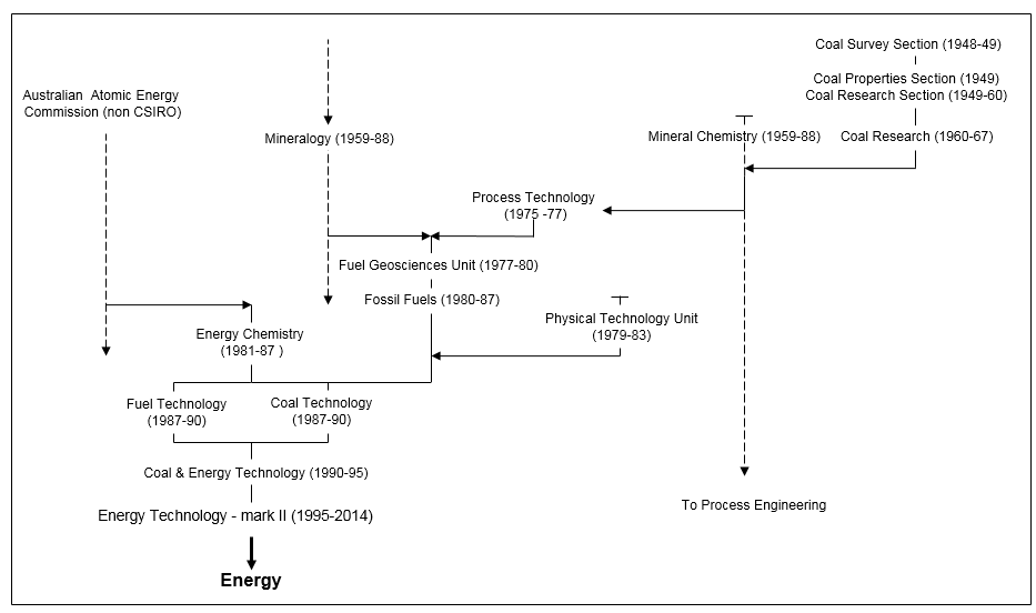 In 1981, part of the Australian Atomic Energy Commission transferred to CSIRO, as the Division of Energy Chemistry. In 1987 the Division of Energy Chemistry was split, with some sections forming the Division of Fuel Technology, and some sections joining the Division of Fossil Fuels to become the Division of Coal Technology. Existing for less than two years, the Division of Coal Technology merged with the Division of Fuel Technology in June 1990 to form the Division of Coal and Energy Technology. In 1995, the division was renamed the Division of Energy Technology (mark II).