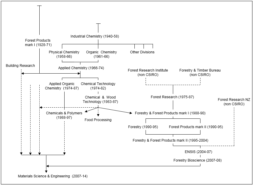 In 1991 the Division spit, becoming the Division of Forestry and the Division of Forest Products (mark II) which remerged in 1995, once again forming the Division of Forestry and Forest Products (mark II). In 2004 the Division of Forestry and Forest Products formed a joint venture with Forest Research NZ to form ENSIS which in 2007 was renamed the Division of Forestry Bioscience.