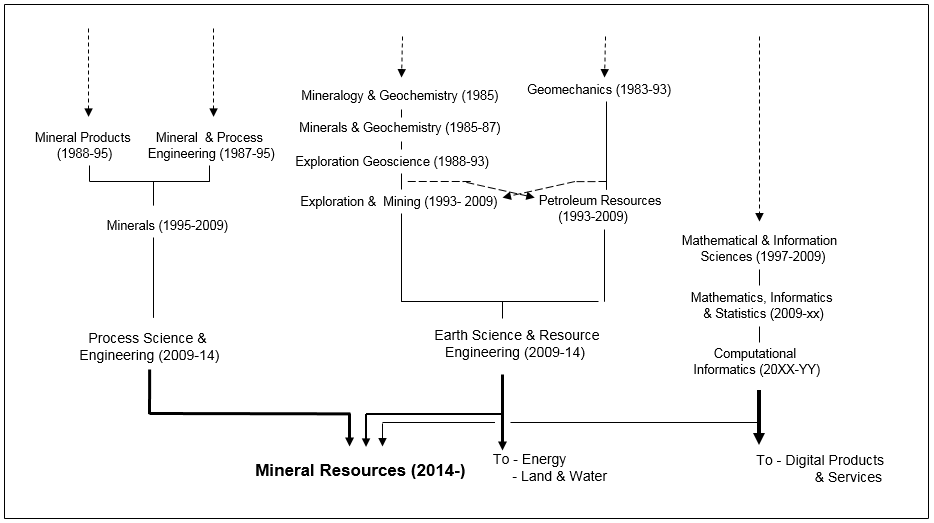 The divisional changes associated with the histories of the divisions that formed the Mineral Resources Flagship are summarized in the figure below with further details at the following links: